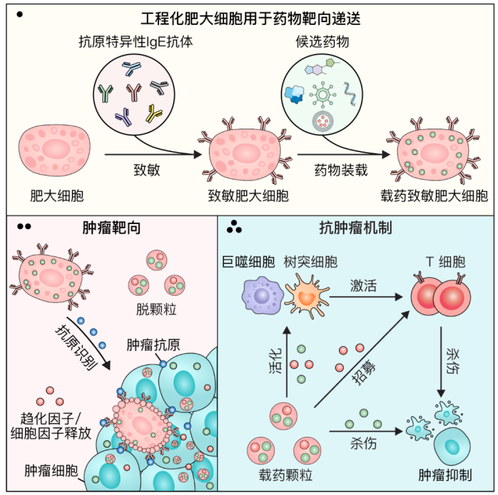 基于IgE致敏肥大细胞的靶向药物递送平台构建及其抗肿瘤机制示意图